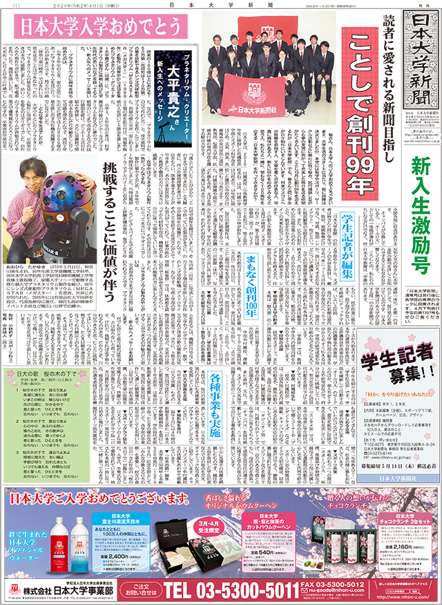 日本大学新聞は各学部をネットワークし「学園の連絡一体化」を第一の目的として毎月発行する全学園新聞です。