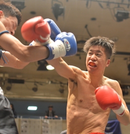 篠原の相手は、過去2試合で本学選手を判定で下した市岡正博(東海大2)。1ラウンド目は互角に打ち合ったが、篠原は2ラウンド残り約1分になって一挙にラッシュ。スタミナ切れでバランスを崩した市岡を押し切り、残り19秒でKО勝ちした。