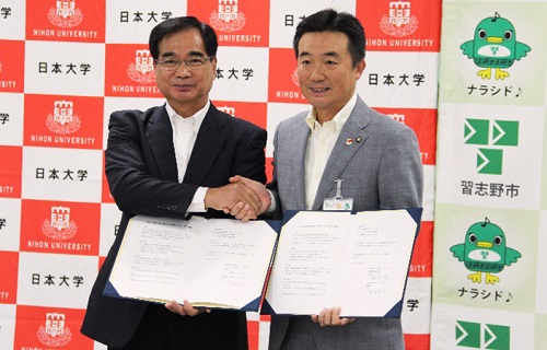 生産工学部は10月26日、習志野市と「地域防災力向上に関する覚書」に調印した。調印式には落合実学部長と宮本泰介市長が出席し覚書に署名した=写真。
