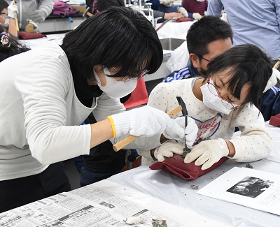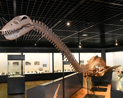 文理学部資料館で開催中の「クビナガリュウとアンモナイトの化石展―白亜の大地に広がる北海道中川町から―」が好評だ。展示の目玉は、関東地区で初お目見えとなった白亜紀(約1億4600万年~6600万年前)の海棲(せい)恐竜クビナガリュウの全身復元骨格。