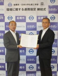 生産工学部はこのほど千葉県船橋市と「環境に関する連携協定」を結んだ。9月1日に同市役所で締結式が行われ、清水正一学部長と松戸徹市長が協定書に署名した。