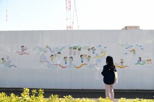 芸術学部デザイン学科3年生福田千尋さんの絵画作品が昨年11月から、東京都練馬区の練馬光が丘病院移転予定地を囲む工事フェンス高さ約3㍍に展示されている。