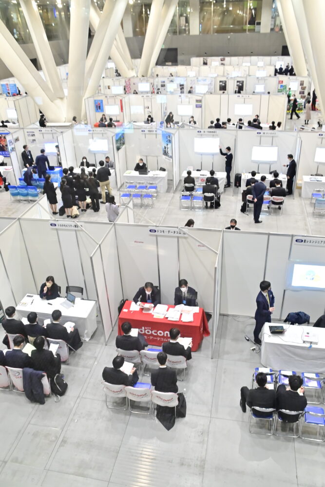 本学では3日に東京都千代田区の東京国際フォーラムで「合同企業研究会・就職セミナー」を開催。新型コロナウイルスの感染拡大が落ち着きつつあることを受け、19年とほぼ同規模で行われ、昨年の倍以上となる265の企業・団体がブースを設け、学生1750人が参加した。同セミナーは昨年同様事前予約制で、学生はあらかじめ記入した「参加目的」を全企業・団体に事前に提示した。