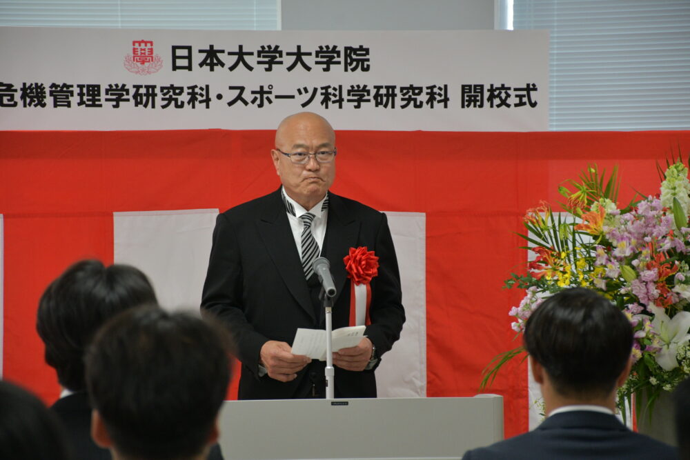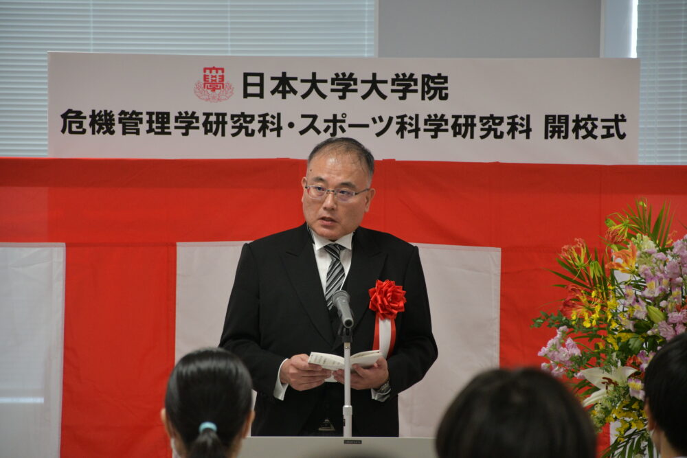 福田充危機管理学研究科長は式辞で「院生と教職員が手を取り合い新しい危機管理学をつくりあげ、それにより平和と幸福がもたらされることを期待している」と新入生を激励した。一方、益子俊志スポーツ科学研究科長は「現場と研究が一体となり、日本におけるスポーツ科学の研究リーダーとなることを期待している」とあいさつした。