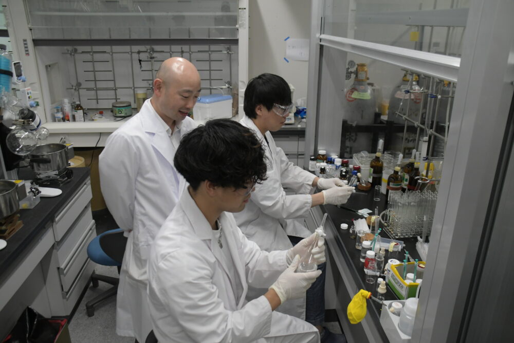 実験中の嶋田准教授(左)と学生たち
