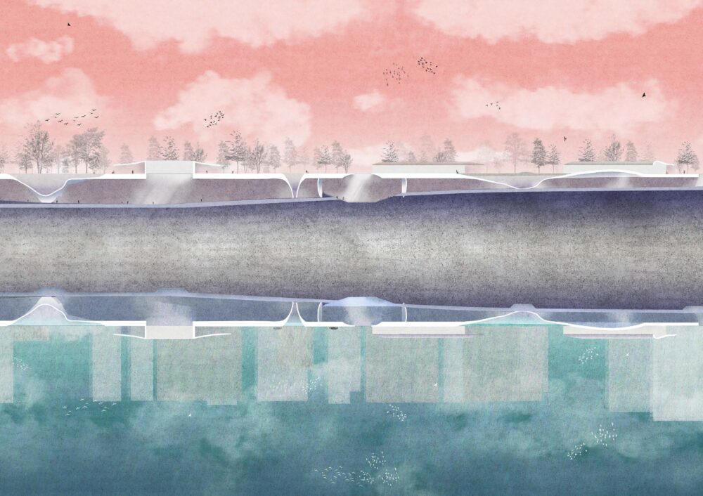 流動的に発展していく現代では自分の感情と向き合う時間がとれない。その中でも、日々の忙しさから逃れ「泪(なみだ)」を流せるような、人々の心のよりどころとなる「心の避難所」を建築空間として提案している。その表現手法として水彩画の流動性を用いたところに新規性があり、評価された。