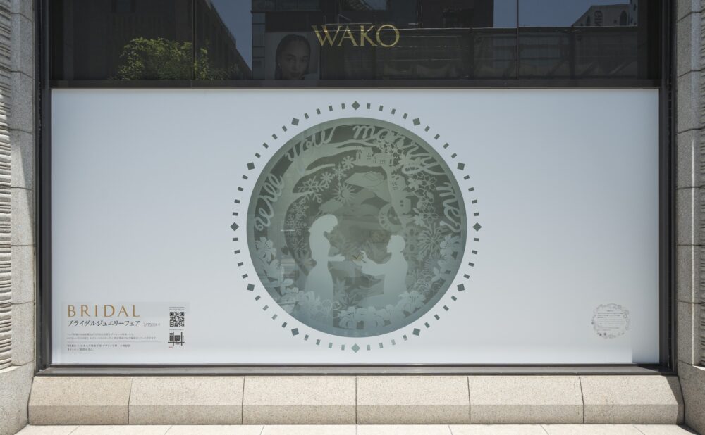 芸術学部の小林結喜さん(デザイン4)がデザインした和光のブライダルジュエリーフェア用のディスプレー「時間を共に」が6月17日から30日まで、東京都中央区のセイコーハウス/和光本店西ウインドウに展示された‖写真(提供‖芸術学部、和光)。