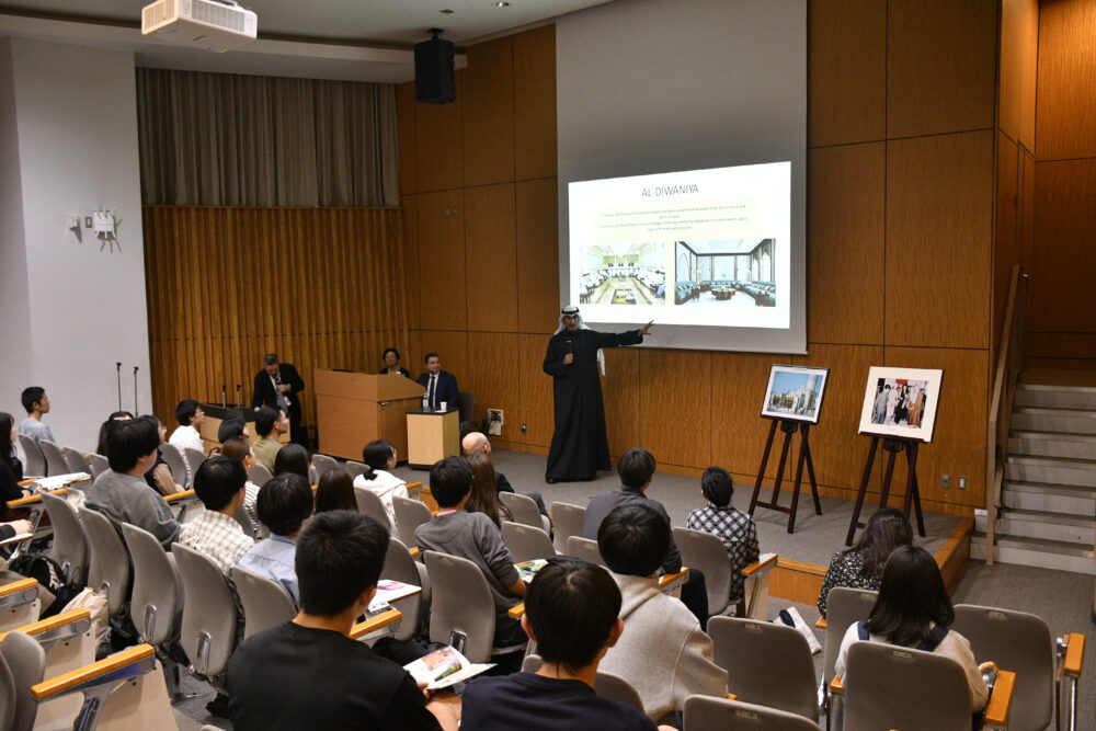 同講演会は、駐日クウェート国大使館と大使館でのイベントや講演会などを行う国歌の輪の協力により実現。円安などの影響で海外渡航が難しくなる中、日本国内で実施できる国際教育の一環として開催した。
