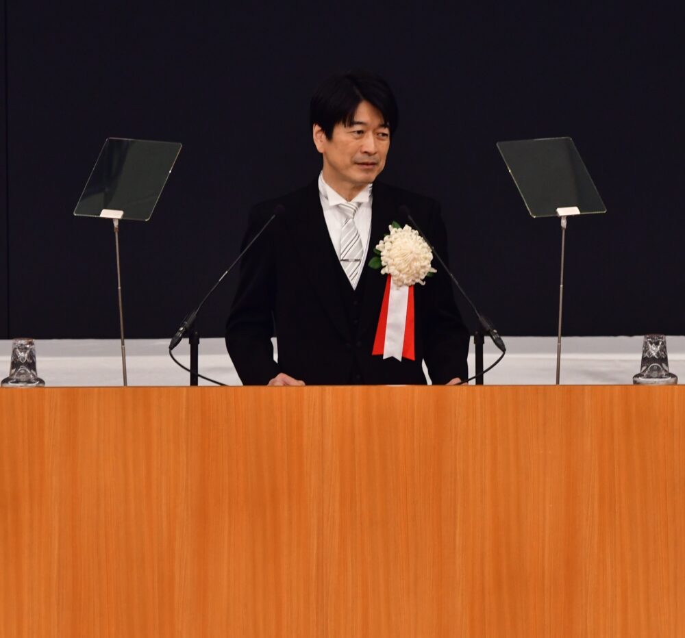 大貫進一郎学長は式辞の中で「『生徒』と呼ばれる受動的な存在から『学生』という能動的な探究者となった今、学びの在り方はリスタートを切る」と探究する重要性を説いた上で、「もし壁にぶつかったとしても、再び立ち上がる『レジリエンス』の力こそ、本学学生の強みと信じている」と語った。