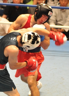 ボクシングの関東大学1部リーグ戦。東農大戦でライトウエルター級全日本ランキング7位の福原徳光(文理2=広島・崇徳高)は、階級を上げてきた山田崇人(2)から3回38秒、強烈な左フックを浴びる。「意識し過ぎて足を使う自分のボクシングができなかった」。果敢に攻めたが及ばず、惜しくも敗れた。 文・写真=渡辺元美