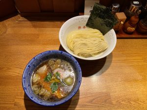 一番人気は「清湯(しょうゆ)つけそば」(880円)。つけそばと言えば、どろっとしたスープと太麺を想像する人が多いと思うが、ここは違う。琥珀(こはく)色のしょうゆベースのスープに麺を一本一本丁寧に折りたたんで丼に盛られた細と平打ちの2種盛だ。いずれも中華麺なのだが、どことなく和の趣を感じる。細麺は食べ応えがあり、平打ち麺は喉越しが良い。いずれもスープとよく絡んで箸が止まらない。280㌘の並盛りをあっという間に食べ終わった。