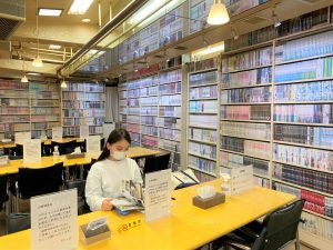 いわゆる「漫画喫茶」とは一味違う。店名に図書館が付くだけあって店内はいたって静か。客がひたすらページをめくる音だけが心地よく響く。子どもからお年寄りまで利用者の年齢層も幅広い。平日は一人で来店する客が多く、誰もが思う存分、漫画世界を味わっていた。