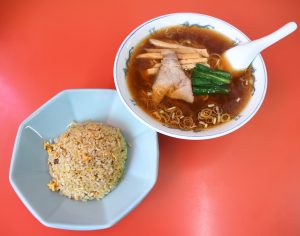 ラーメンスープは鶏がらと豚骨などでダシを取ったしょうゆベース。少し柔らかい中太の縮れ麺とよく合う。具材はメンマと青菜、チャーシュー、刻みネギのみ。メンマは太く、食べ応えがある。チャーハンの具材は卵、ネギ、チャーシューの3種のみ。こしょうが効いて、ラーメンのスープとの相性が抜群だ。