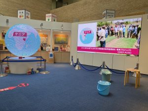 入ってすぐにある常設展示室は広さ約115平方㍍。中央には縦約1・5㍍、横約3㍍の大型スクリーンと、直径約1・2㍍の地球をイメージした球体ディスプレーがある。スクリーンの前にはタッチパネル。国連が掲げた「SDGs(持続可能な開発目標)」の17目標のうち「気候変動」「教育」など8テーマについて学べるようになっている。タップすると大型スクリーンと球体ディスプレーに、選択した項目についての映像が映し出される。例えば廃棄食糧に関するテーマでは、開発途上国と日本を比較して、4択クイズを使って学べる。