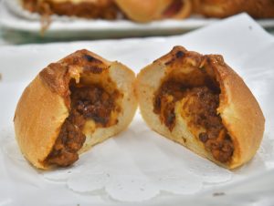 萩原さんが「学生向けに」と勧めるのは「フランスカレーチーズ」(200円)。フランスパン風に堅めに仕上がったパンの香ばしさがまず、口いっぱいに広がる。カレーあんはひき肉たっぷりでスパイスが効いたピリ辛仕立て。ボリュームも十分で一つだけで満足感が得られる。