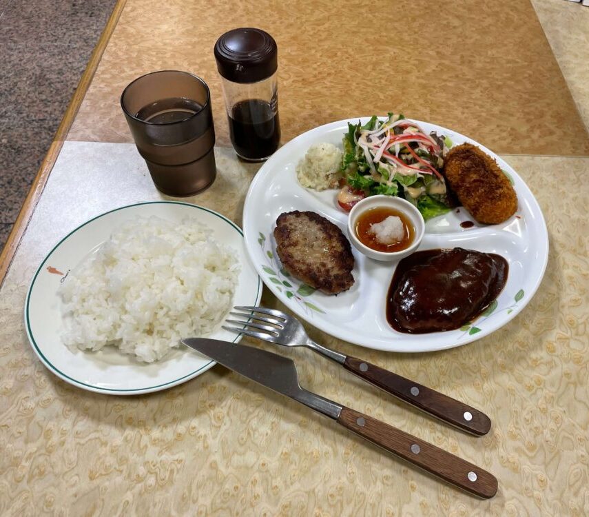 ハンブンバーグは、つばめグリル時代に学んだ牛肉7、豚肉3の黄金比率で作られるハンバーグに加え、ランチは唐揚げか生姜焼き、ディナーはカニクリームコロッケを含む三つの中から好みの一品を選べる。