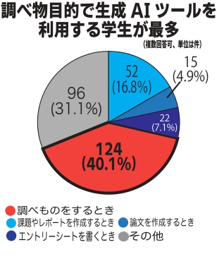 生成AIツールを使用する目的として最も多かったのは「調べ物をするとき」で、全体の40・1%(124件)。感想として「一瞬で出てきた」「時間と労力を削減できた」と感嘆する記述が目立った。