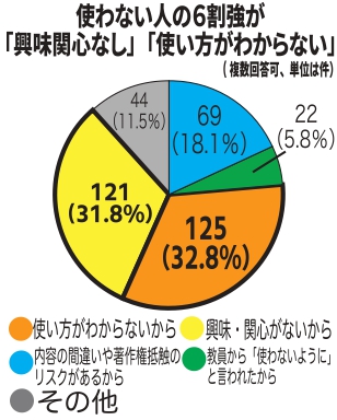 他に「内容の間違いや著作権抵触のリスクがあるから」が文系を中心に18・1%(69件)、「教員から『使わないように』と言われたから」が5・8%(22件)と続いた。