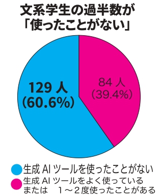 文系学生は全体の60・6%(129人)が「使ったことがない」と回答。全学部で「使ったことがない」が優勢であり、文系学部生の生成AIツールに対する使用への消極姿勢がうかがえる。