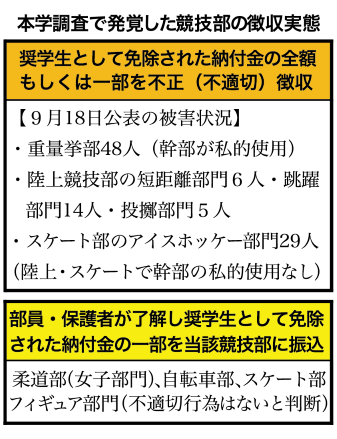 本学は9月18日、重量挙部以外に2競技部(陸上競技部、スケート部)で奨学生部員・保護者からの納付金の不正(不適切)徴収が発覚したと公表した。重量挙部の不祥事事案は過去10年以内の部員・保護者の被害額が3685万円に上り、被害者は48人に達する。