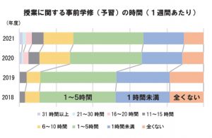 1週間のうち、予習に充てる時間を問う質問では「全くない」「1時間未満」「1~5時間」「6~10時間」「11~15時間」「16~20時間」「21~30時間」「31時間以上」の8択のうち、「1~5時間」以上が67・1%(19年度52・6%、20年度66・6%)となった。復習に充てる時間は「1~5時間」以上が74・5%、(19年度55・3%、20年度73・5%)で、その他の項目も予習時間とほぼ同様の結果となった。