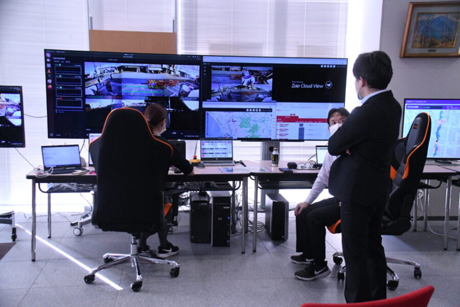 11月に実施したJR沼津駅南口と沼津港間約3㌔㍍を走行する実証実験では、同校舎内に自動運転の「遠隔コントロールセンター」を設置‖写真(下)。公道を使用した自動運転車の走行状況をリアルタイムで監視したり、自動運転車の運行可否の判断支援を試行したり、2台の車両を1人の監視者で同時に監視する実験を行った。