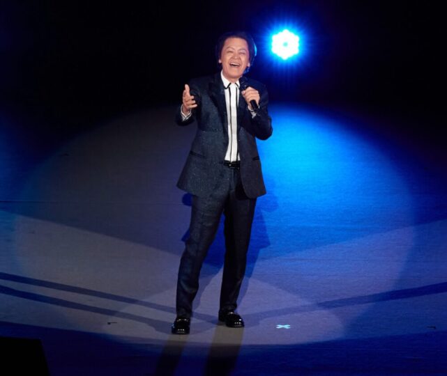 特別映像は、本学生と映像制作会社「BABEL LABEL」によるコラボレーション企画で、本学OB、OGを街中で探す動画を上映。その後に劇団四季所属の俳優・木村智秋さん(大学院芸術学研究科修了)が登場。有名なミュージカルナンバーを披露し会場は感動の渦に包まれた。式の最後にはエアーショットからメタルテープが発射された。