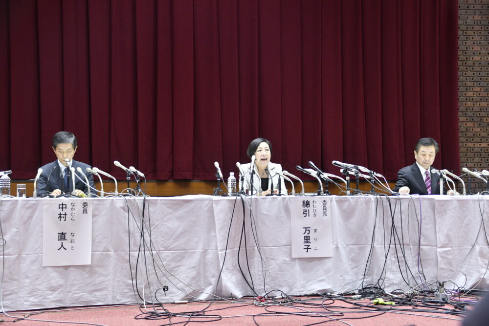 記者会見(10月31日)を行う綿引第三者委員会委員長(中央)、中村委員(左)、小林明彦委員