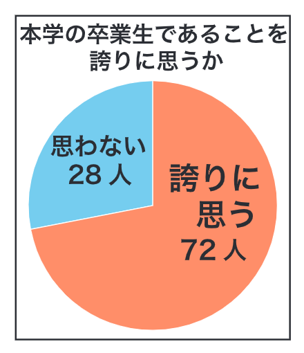 「本学の卒業生であることを誇りに思うか」という質問に、約7割が「誇りに思う」と回答。「誇りに思わない」と答えた学生からは「不祥事が多すぎる」などの意見が上がった。