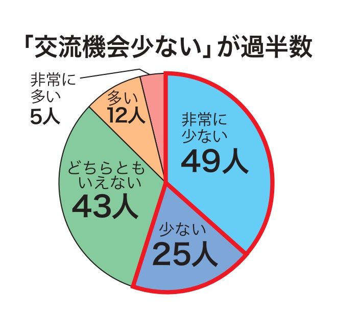 加えて「自分の学部の卒業生と交流する機会は多いか」との問いに「非常に少ない」が49人、「少ない」が25人と計74人(55%)が交流機会は少ないと回答。「他学部の卒業生との交流」も「非常に少ない」が80人と約6割を占めた。