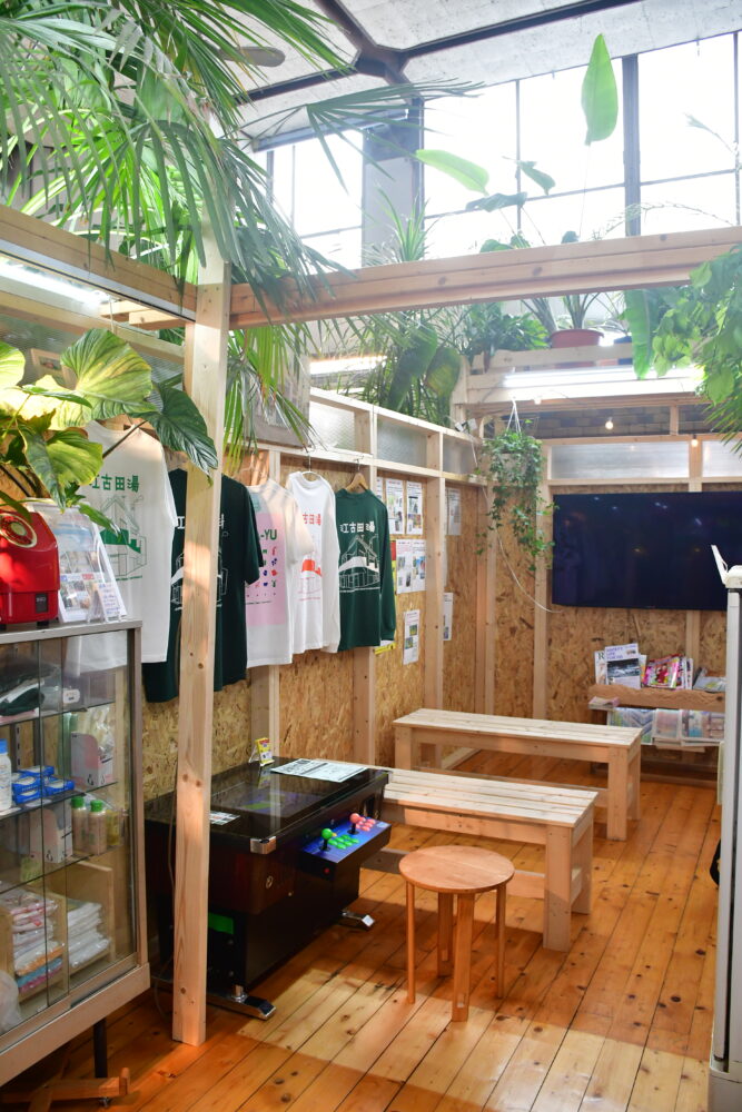 入り口を抜けた先のロビーには3代目主人・法橋(ほっきょう)広歩(ひろむ)さんがDIYで作り込んだくつろぎスペース。そこには、計60種類のレトロゲームが遊べる筐体が設置され、老若男女問わず楽しめる。