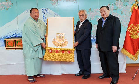 大相撲名古屋場所での十両昇進が決まった木崎海関(木瀬部屋=本名・木崎伸之助、2018年法卒)に、本学から化粧まわしが贈られた。