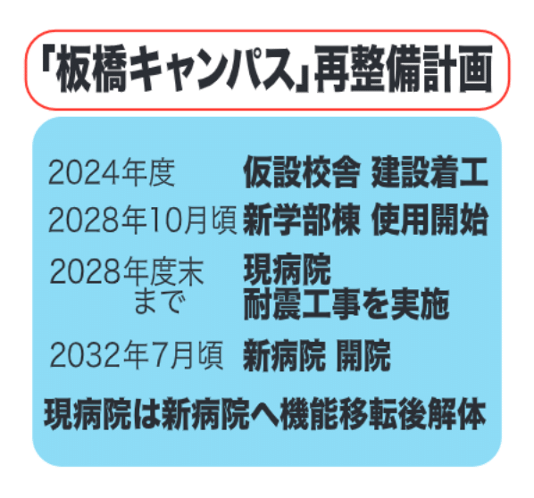 医学部付属板橋病院と同学部校舎の建て替え・耐震化事業「板橋キャンパス」再整備計画がいよいよ始動する。まず7月5日の理事会で同学部校舎建て替えの設計・監理者を決定。今年度から仮設工事に着手、2028年10月から新学部棟を使用開始、32年7月頃に新病院を開院する計画。
