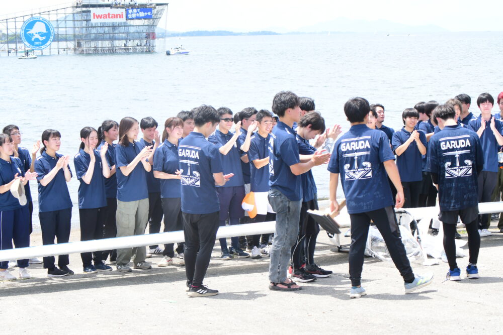 理工学部の航空研は、過去に学生記録を樹立した経験を持つ強豪校として参加。しかし、大会の約2週間前に機体の故障が発生。飛行直前に機体審査を通過するも、プラットホームからの離陸直後に下向きの風を受け、25・45㍍地点であえなく着水した。