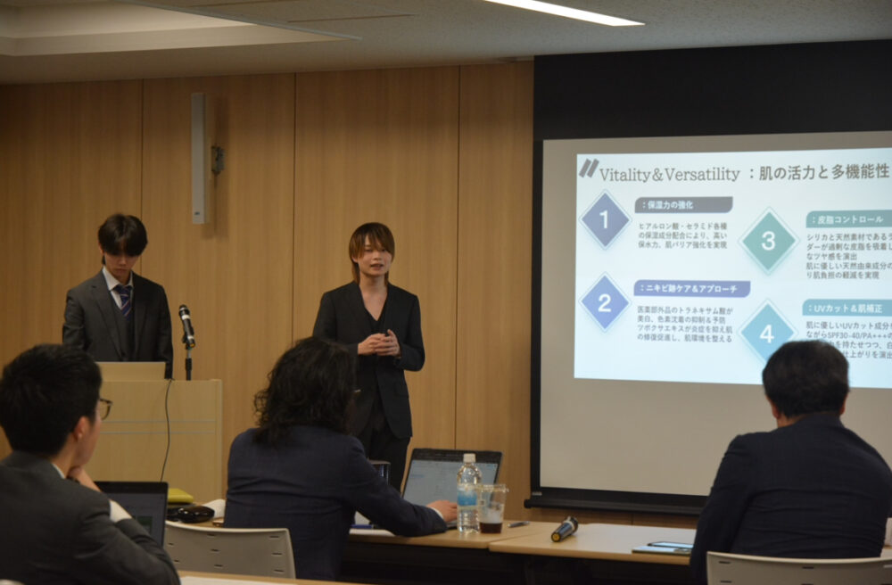 最優秀賞に選ばれた前田さんと徳丸さんは働く男性をターゲットに、スキンケアとメイクの両方の機能を備えた「VVクリーム」を開発。肌に関する市場調査をもとに販売戦略を発表した。