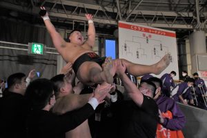 決勝の相手は昨年のアマ横綱花田秀虎(日体大2)で、昨年の同大会団体戦以来の顔合わせとなった。立ち合いで鋭く踏み込んだ川副は、花田の懐に入りもろ差しになると一気に前に出て寄り倒し、仲間が見守る東の花道に向かってガッツポーズを見せた。