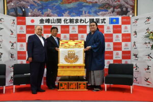 大相撲名古屋場所での十両昇進が決まった金峰山関(木瀬部屋=本名・バルタグル・イェルシン、2021年スポーツ科卒)に、本学から化粧まわしが贈られた。金峰山関はカザフスタン出身として初の関取となり、本学スポーツ科学部卒としても初めて。
