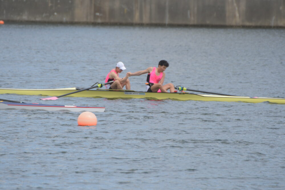 同ダブルスカルの予選は500㍍地点を2位で通過。勢いに乗ったまま1位でゴールし決勝へ進出した。決勝は4位で発進。1000㍍地点を3位で通過した。1位の日体大、2位の立命大との差を縮めることができず3位に終わった。