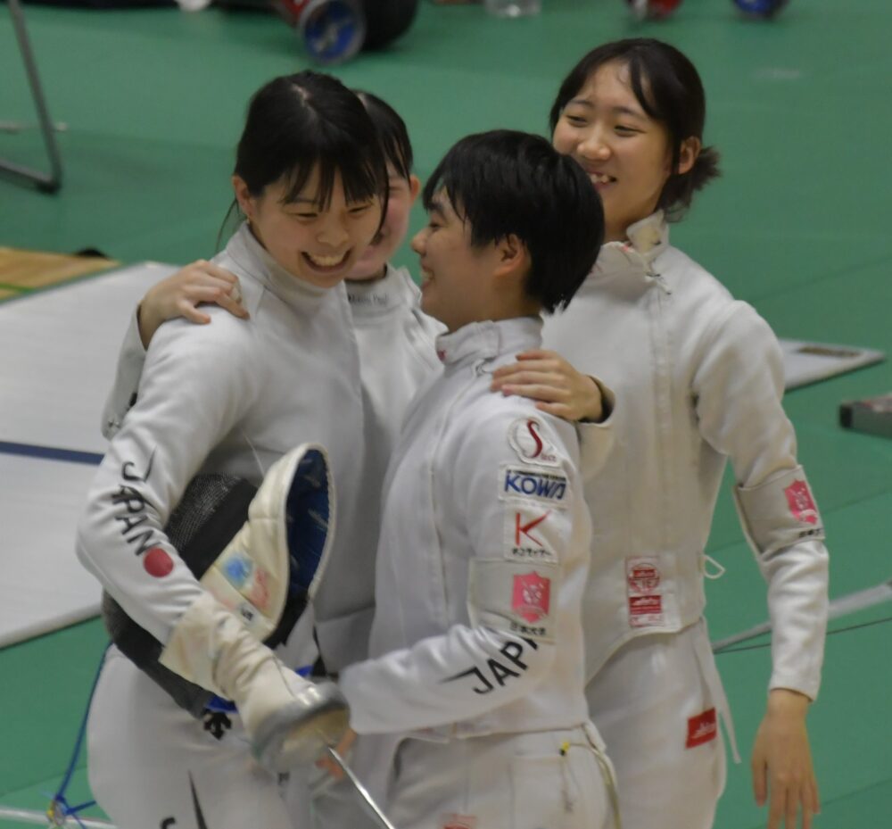 12日に行われた同サーブル団体では、準決勝で早大と対戦。5セット目で19―25と危うい展開に。しかし、迎えた7セット目では高橋ひかり(文理3=愛媛・三島高)が12得点を奪う大奮闘を見せ、45ー40で決勝へ進んだ。決勝の相手は朝日大。本学は9セットすべてを5点先取する安定した攻撃を見せ45―35で撃破した。3チームの熱い奮闘によって、2年連続で女子団体3種目の頂点に立った。