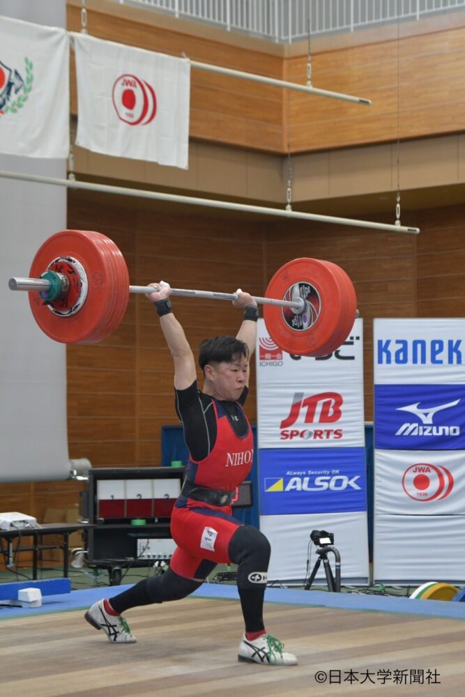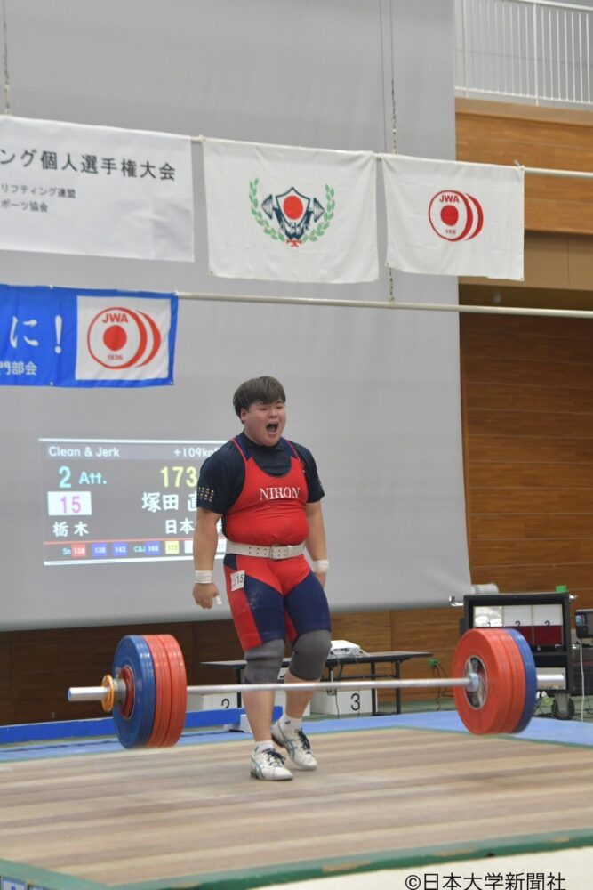 同109㌔超級の塚田はスナッチ3本目で143㌔を上げ1位。2位の寺西洸志郎(明大4)に13㌔差をつけた。ジャークでは168㌔、173㌔と順に成功し2位。トータルは316㌔で優勝を飾った。