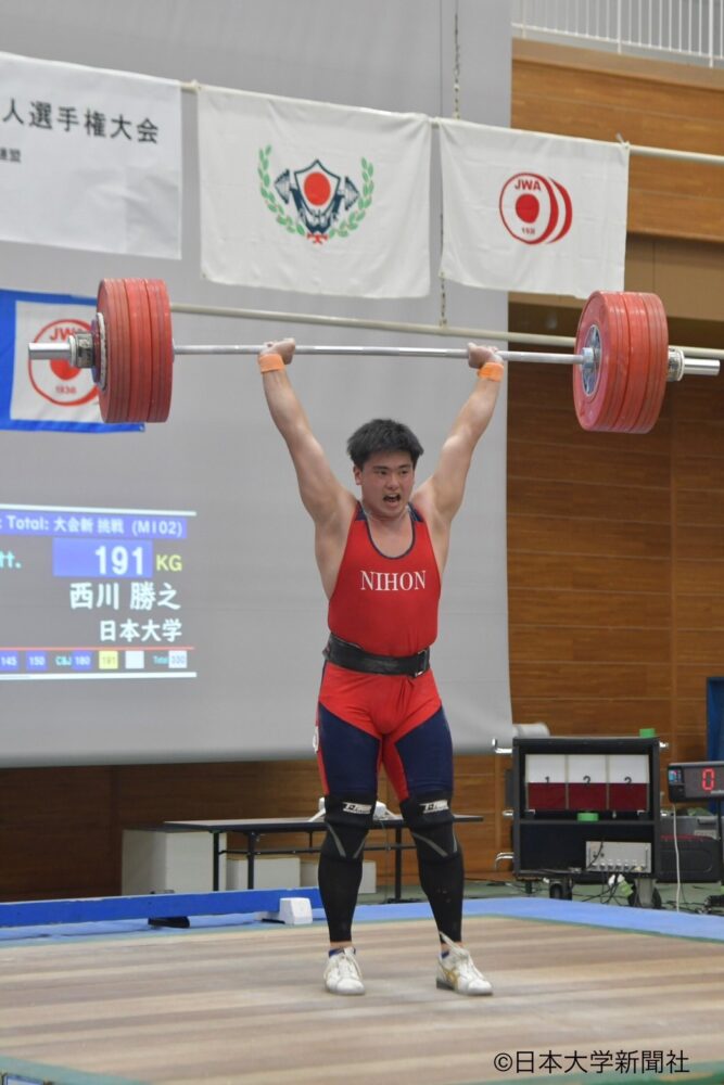 重量挙げの全日本学生個人選手権が5月10日から12日まで大阪府羽曳野市のはびきのコロセアムで行われ、男子102㌔級の西川勝之(文理3=京都・朱雀高)がスナッチ、ジャーク、トータルでそれぞれ大会新記録を樹立し完全優勝を果たした。