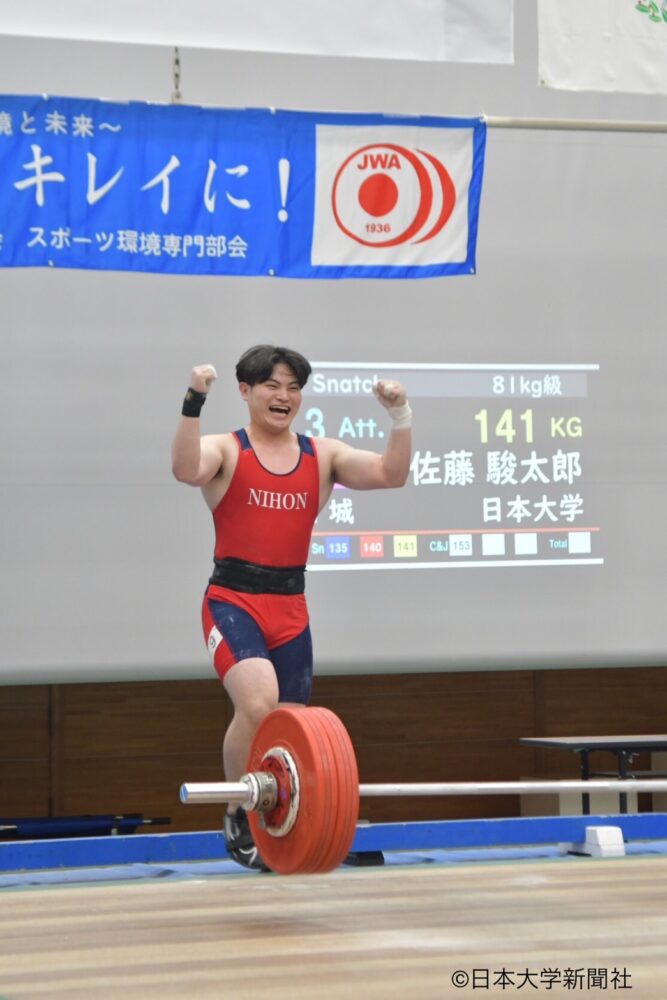 同81㌔級の佐藤はスナッチ3本目で141㌔に成功し、2位の吉野真太郎(早大3)に11㌔差をつけ1位。ジャークでは158㌔で3位だったが、トータルで299㌔となり優勝を果たした。