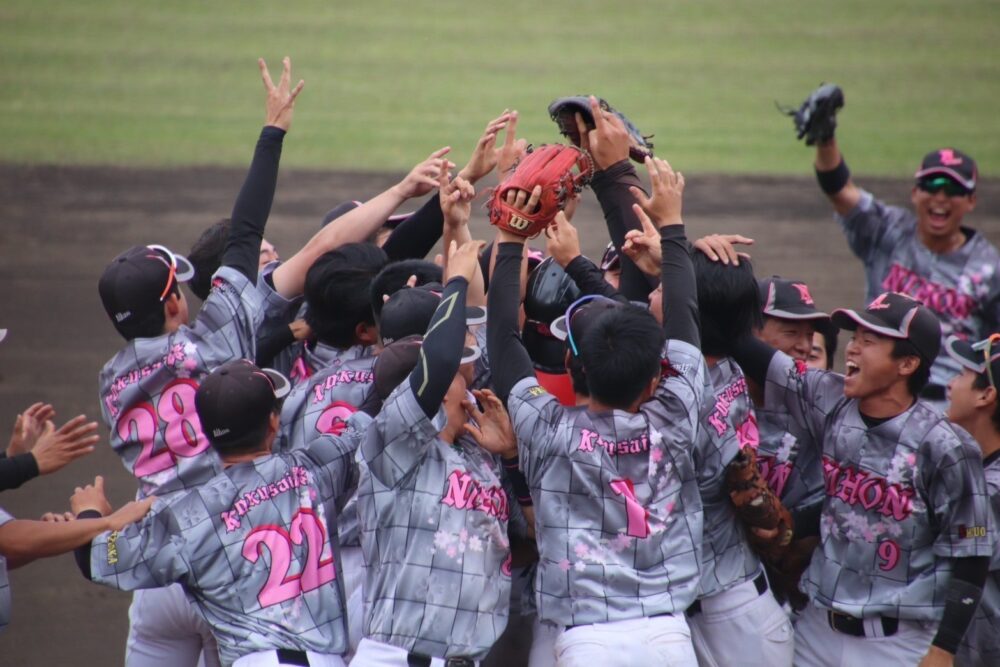 先発投手の林京平(国際教養3)が8回裏まで10奪三振・無失点の好投。しかし、9回裏に4連打を浴び1点を失った。さらに一死満塁で継投の佐藤開(国際総合政策3)は押し出し四球を与え2点目。後続の高田基人(同3)も適時打などで3点を奪われたが、1点差を守り切り6―5で辛くも勝利し優勝を果たした。