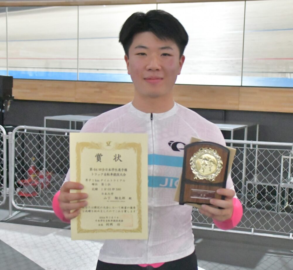 2日目に行われた同1㌔㍍タイムトライアルは予選なし、決勝一本勝負で行われ、31人が出場。最後に出場した山下はそれまで1位だった福地晶(法大4)の1分4秒494を、0秒914上回る1分3秒580のタイムで優勝。1年生ながら見事栄冠を勝ち取った。
