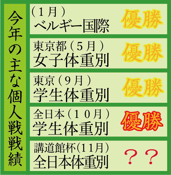 準決勝で対戦した吉岡とは東京学生体重別選手権でも対戦し勝利した。しかし、「たまたま勝っただけ」と気を引き締め、必ず勝てるように研究を重ねた。西田コーチを相手に見立て、技をかけることを意識。試合では研究の成果が思い通り発揮され、納得感を持って勝ち切った。