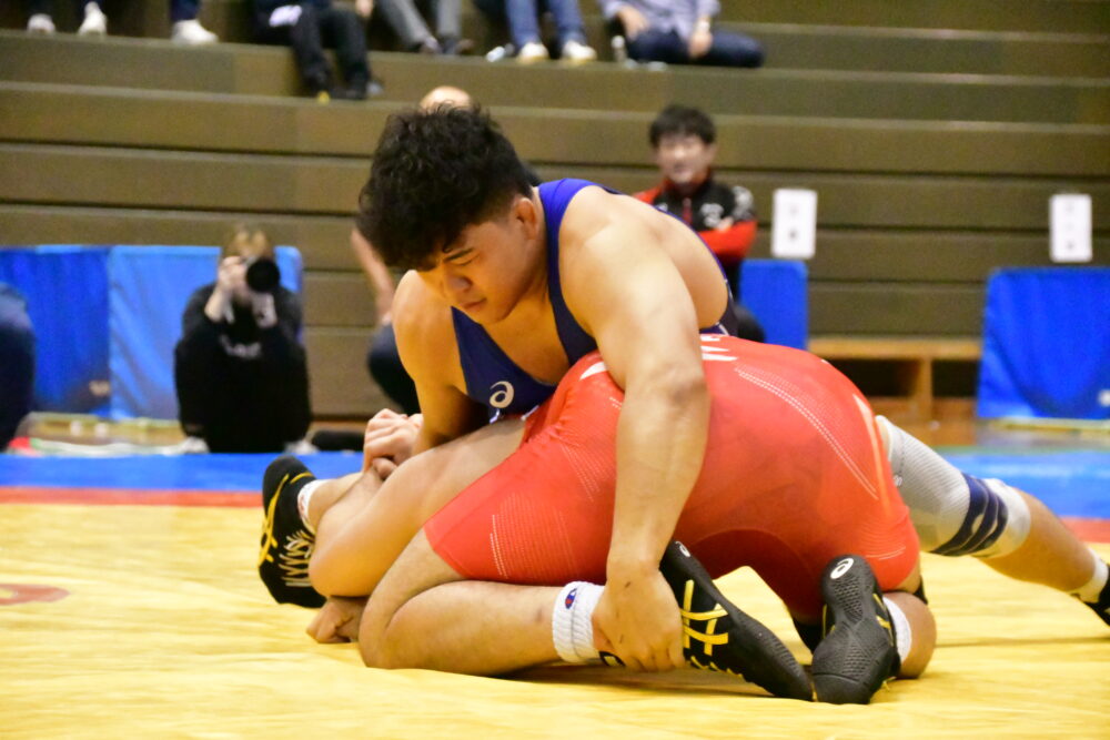 同97㌔級では敵なしの吉田。「世界で戦っていくために、他大学に留学生がいるこの階級にチャレンジしたかった」と階級を上げた理由を話し、9日の準々決勝で昨年の覇者で留学生のバトバヤル・ナンバルダグワ(育英大2)と対戦。豪快なタックルから一気に抑え込み、開始1分47秒にフォールで撃破した。丸山政陽(日体大2)との準決勝は、序盤から順調に得点を重ね2分32秒でフォール勝ち。準決勝までの3試合すべてをフォール勝ちで決勝に駒を進めた。