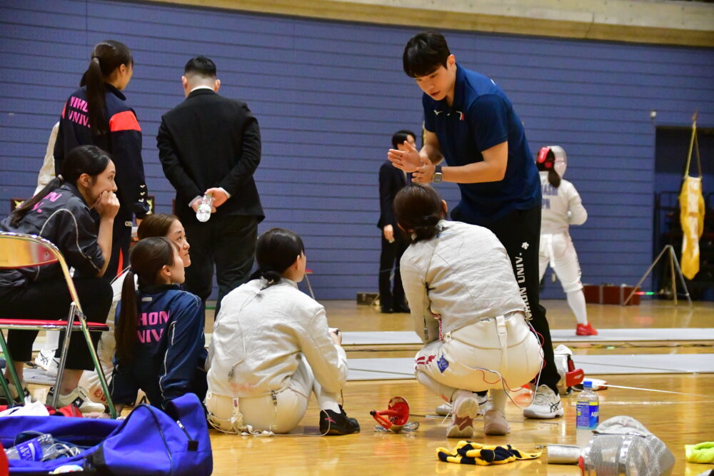試合後、女子サーブル団体のメンバーにもコーチングする樋渡(右)