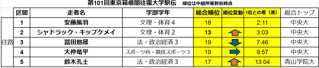 4区はエントリーしていた高田真朋(スポーツ科2=宮崎日大高)が当日に高熱を出したため、当日変更で副主将の大仲竜平(同3=沖縄・北山高)が出走。徐々に順位を上げ区間17位で5区へ。