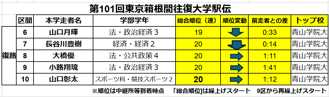 山梨学院大と大東文化大と共に繰り上げスタートとなったアンカーの山口彰太(スポーツ科2=佐野日大高)は最後の意地を見せ、区間15位で大手町に帰着。総合20位に終わった本学は古豪復活に向け、本戦3年連続出場を目指して再スタートを切る。