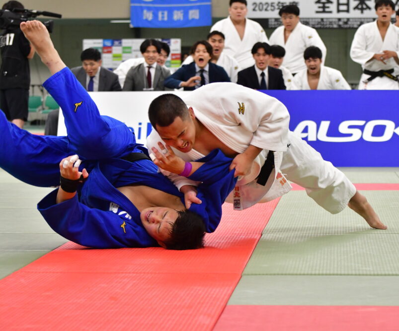 天理大との決勝は先鋒のペレンレイジャイムツ・オスホバヤル(同4=新モンゴル高)、次鋒の太田隆介(法4=愛知・桜丘高)が引き分けとなり膠着状態に。試合が動いたのは五将戦。村瀬浩樹(文理3=兵庫・神戸国際大付高)が相手を隅落としの技ありで制し、先制する。さらに三将戦で浜田が残り19秒で一本背負い投げを決め2―0。流れは本学に来たと思われたが、副将戦で庄司陸吾(法4=山形・羽黒高)が一本負け。勝負は大将戦に持ち越された。